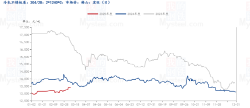 伴随实施专项提振消费专项行动,3000亿特别国债支持消费品以旧换新,叠加“双碳” 目标下绿色建筑、新能源汽车等新兴需求释放,市场对不锈钢消费增长预期升温,加之镍价逐步上移,期现价格齐涨,但截至2025年3月10日,佛山不锈钢304冷轧宏旺毛基13100元/吨,市场价格上涨幅度整体稍显理性,涨幅为1%。