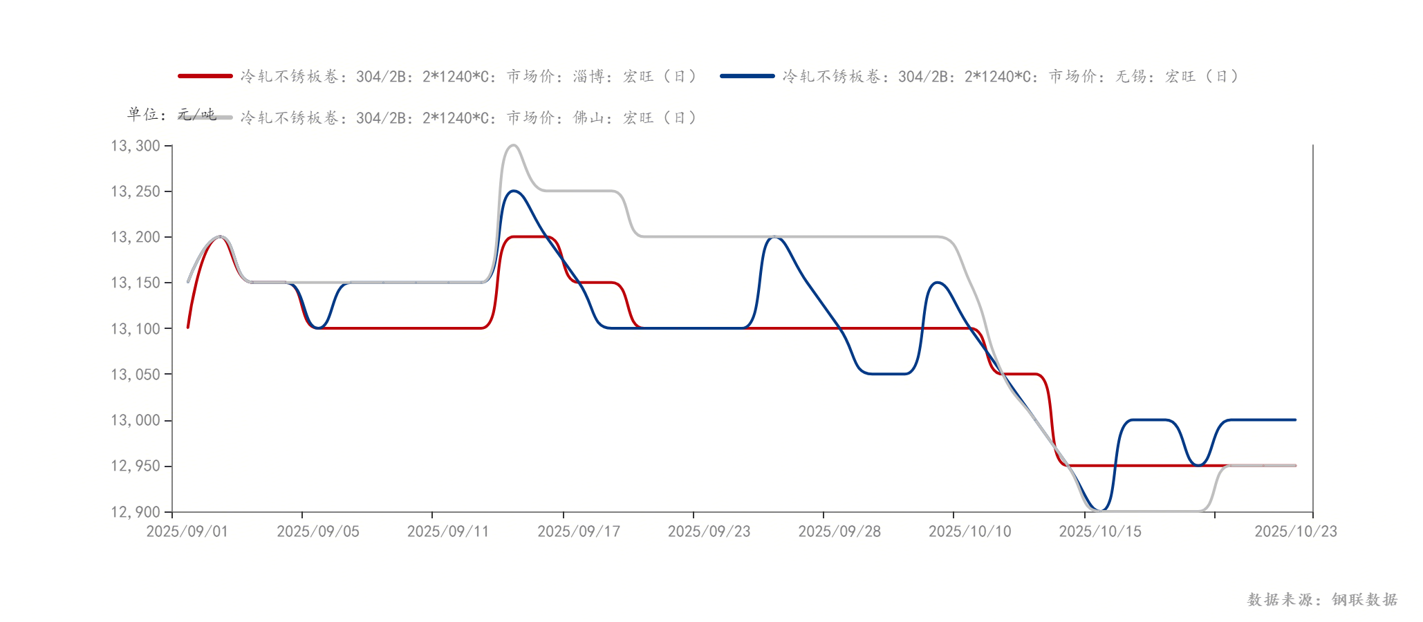 在现货市场方面,以无锡、佛山、淄博为代表的地区作为全国不锈钢集散中心,其价格走势具有重要风向标意义。10月以来,民营钢厂304冷轧毛基(2.0mm)主流报价在 12600–12800元/吨 区间内窄幅波动。