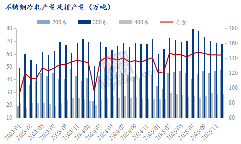 供应端呈现结构性调整,钢厂为缓解利润压力加大检修力度,据了解,2025年11月国内39家不锈钢冷轧产量合计144.38万吨,环比减少0.18万吨,减幅0.12%,同比增加4.47%。钢厂产能利用率为74.6%,环比减少0.1个百分点。12月全球不锈钢产量预计环比显著下降,一定程度上边际缓解了供应压力。然而,社会库存仍处于高位,且海外资源持续回流,市场可流通资源总量宽松的格局未发生根本改变,制约了价格反弹空间。期货市场上,持仓量逐步缩减,反映市场在价格底部区域趋于观望,反弹动能不足。现货市场价格随期货小幅调整,贸易商受资金回笼压力影响,部分存在降价促销行为,整体成交表现时好时坏。