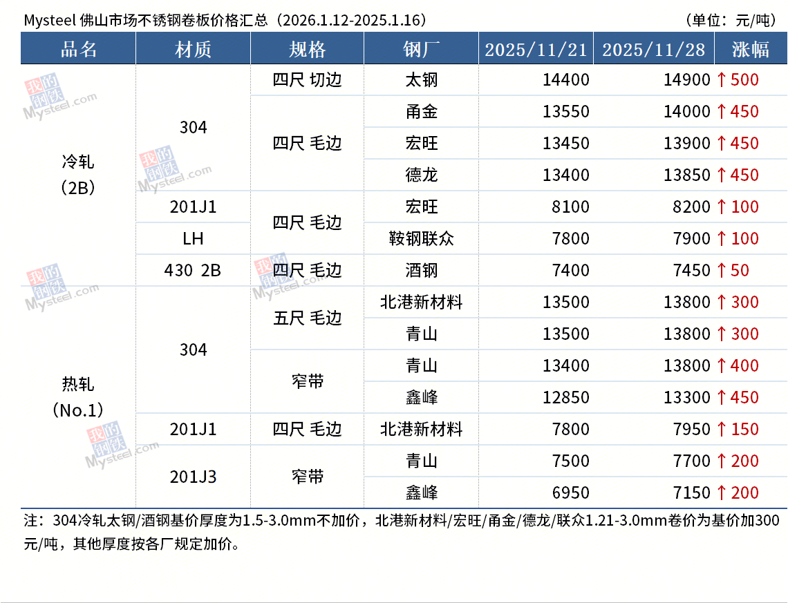 本周佛山不锈钢板热轧市场:304热轧五尺主流价格13800元/吨,周度涨300元/吨。