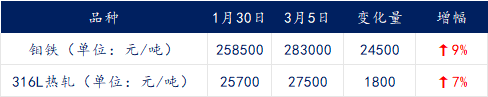 近期316L不锈钢板价格的上涨仍旧是典型的成本推动型行情,当前钼矿价格虽有涨速放缓的趋势,但钼铁的成本仍旧偏高,短期钼价运行仍较坚挺,市场看涨情绪仍存;而需求端,目前市场正处于节后恢复阶段,旺季预期支撑及市场对两会仍存利好预期下,商家挺价心态仍存,预计短期价格偏强震荡,后续重点关注钢厂采购落地及矿端出货节奏。