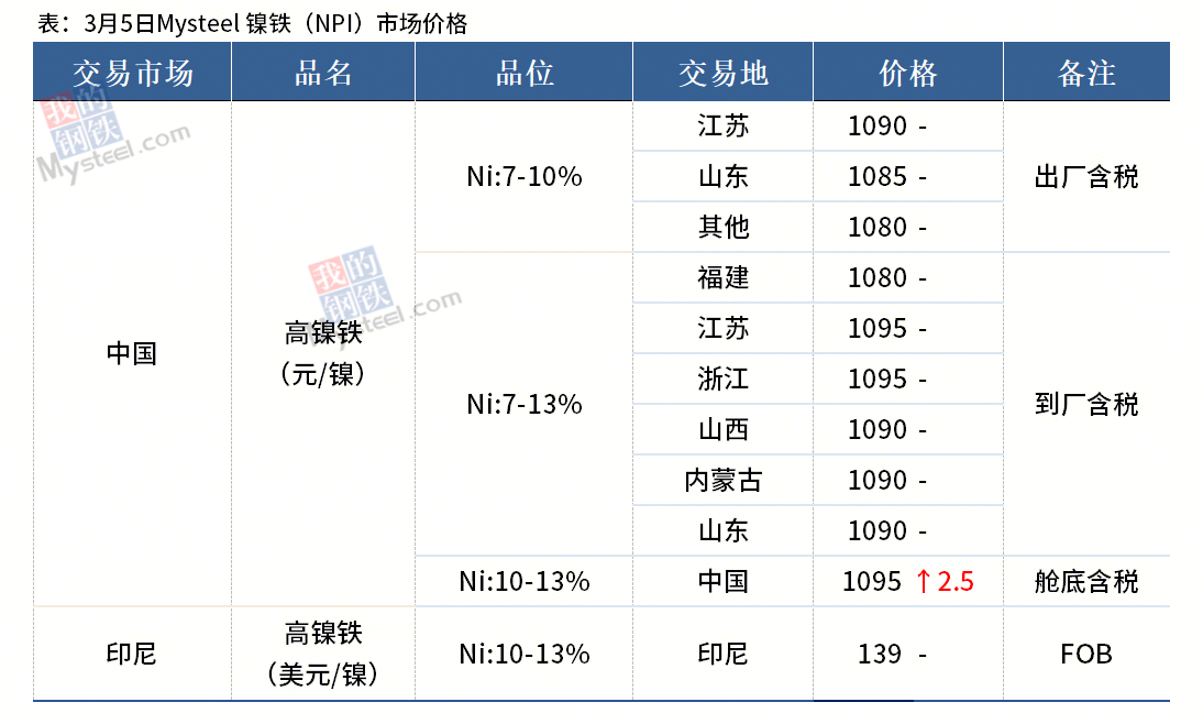 镍铁方面,印尼镍矿配额缩减叠加雨季、斋月影响,镍矿供应紧张,成本支撑强化。镍铁厂挺价意愿强烈,截至3月5日,Mysteel高镍铁国内出厂价暂稳至1080-1090元/镍;国内到厂价暂稳至1080-1095元/镍;印尼高镍铁舱底含税价上调2.5元至1080-1110元/镍,印尼镍铁FOB价暂稳至139美元/镍。另外,据调研,华东某钢厂3月5日在市场上询盘,市场报价集中在1100元/镍(到厂含税)左右,预计3月镍铁价格震荡偏强运行。
